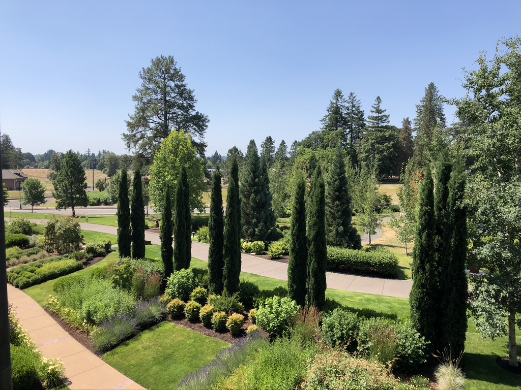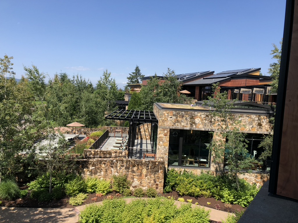 After getting our fill at King Estate we drove North to try Willamette Valley Vineyards. Andy, our neighbor, in Tuscaloosa, Alabama first introduced us to this wine. His brother was the winemaker at the time. What a small world. This winery was another home run with its sweeping views and rolling vineyards although it is close to the Interstate. We sampled the Whole Cluster, Ribbon Ridge and the Estate variety of Pinot Noirs. The Whole Cluster is our favorite. We sat outside on a cool, cloudy June and it did get a little chilly. But it is often chilly this time of year in the Pacific Northwest. We sipped wine and snacked on yummy food from the onsite restaurant. It was late afternoon and most wineries close around 6:00, so we headed back to the Allison hotel. We took a stroll around the grounds at the hotel before we sat down for dinner.