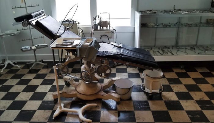 We started the tour on the first floor which housed an old hearse looking ambulance. Nothing too scary was on the first floor. As we walked up the stairs to the second floor of the hospital, I began to feel a little uneasy. The stairs creaked with every step. It was dark and eerie, and the items on display made me a bit nervous. I eyed long needles sitting next to a needle sharpener. They didn’t have disposable needles in those days, so they used the same needle over and over while sharpening it from time to time. Old bottles and apothecary items were everywhere. The surgery room was even scarier.