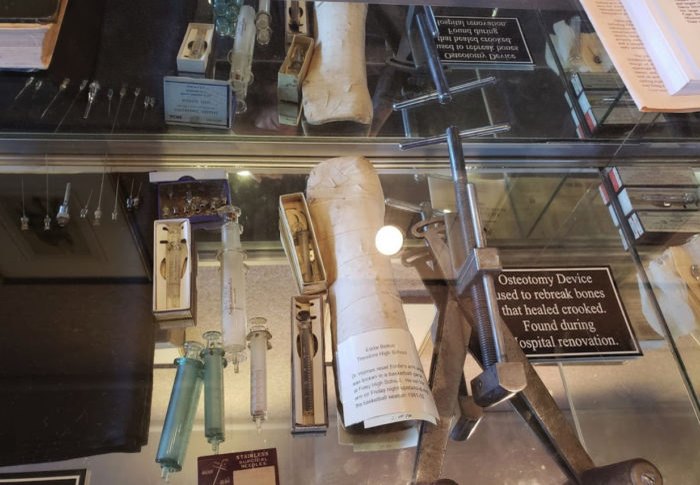 Let me provide a little background first. The museum in Foley is housed in a former hospital built in 1936 that closed in 1958. Many babies were birthed in the hospital, in fact, the docent giving the tour said she was born in the hospital. Doctors also performed surgery and took care of whatever ailed the townspeople. The equipment looks medieval compared to today’s standards. We saw things like reusable needles, cane back wheel chairs, metal probes, jars of antique bones and get this, a real skeleton. Yes the bones were real.