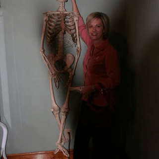 Before I go on, keep in mind that this was a cloudy day. There was only one window at the opposite corner of an approx. 200 square foot room, no other people were in the room, no shadows to cast, and no flash was used. Patrice had a long lens on her camera (about 10 inches). I leaned in toward the skeleton to make it appear that I was touching it when in actuality I was slightly behind it. I asked Patrice to hurry and take my photo. My bravery was quickly waning.