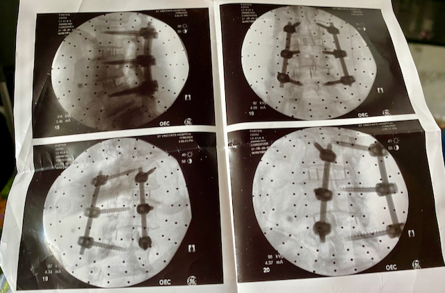 The morning of the surgery I arrived with my husband for my 6:00 a.m. surgery. We didn’t wait in the waiting room very long before getting called back from prep. I remember getting prepped for surgery and getting an IV in my arm and that’s about all I remember before waking up in a room in St. Vincent’s hospital. I’m told that during surgery Dr. Cordover had to find screws small enough for my back. Glad they are small, but they look huge on x-rays.