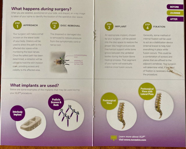 Dr. Cordover explained that a relatively new robotic back surgery eXtreme Lateral Interbody Fusion (XLIF) would allow for less invasive surgery, one to two-night hospital stay and a quicker recovery time; although, full recovery would still take anywhere from six months to one year. Dr. Cordover said that the XLIF surgery allows for a side incision instead of cutting directly into the back, which could sever and damage nerves. He recommended fusion surgery on two levels of my lumbar. Thank God for new technology.