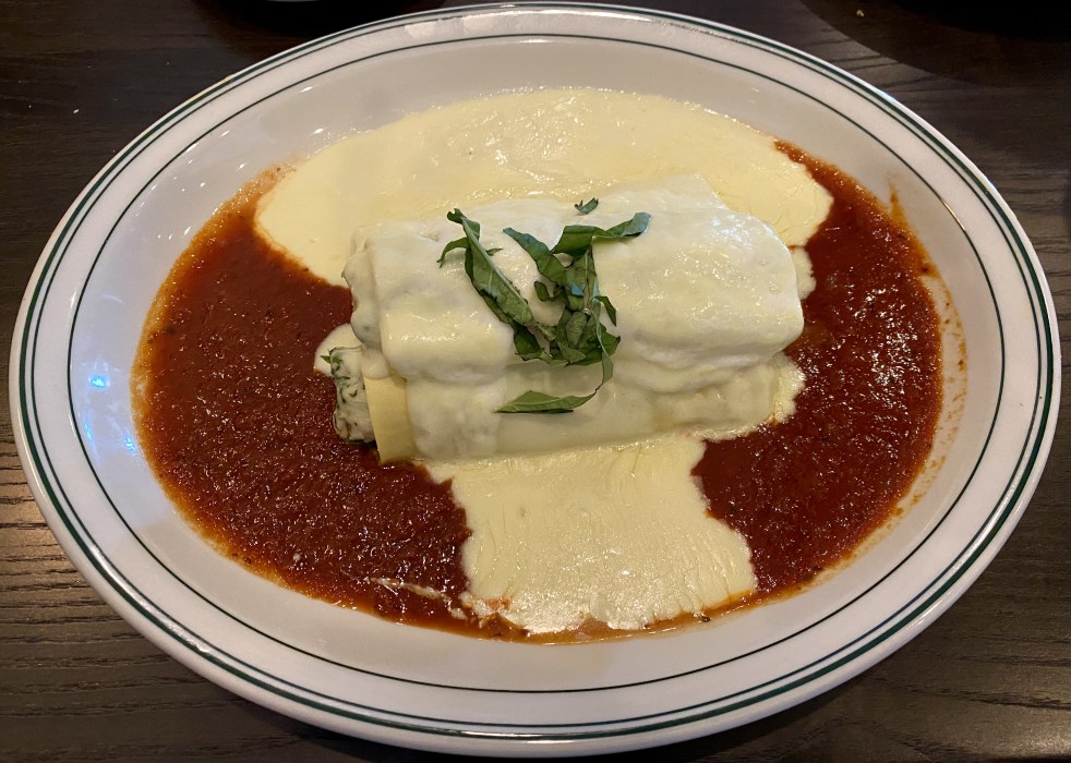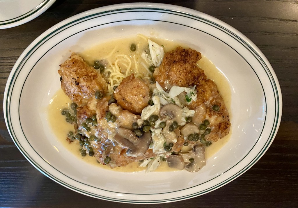 Then came the entrees. My first bite of the Cannelloni was a savory blend of chicken, ricotta cheese, spinach, mozzarella, tomatoes and cream sauce. I was in food heaven. It was even better than the Italian Restaurant that had been my favorite for years in Tuscaloosa, Alabama— Depalma’s. I took bite after satisfying bite until I couldn’t eat anymore. The portions are filling enough to ask for a to-go box, which I did. I also tasted my husband’s Chicken Piccata, a dish that I also make at home on occasion, and it was yummy. The Piccata came with mushrooms and crab meat on top which was a little different variation than I have eaten; nevertheless, we both came away with boxed up treats for lunch the next day.