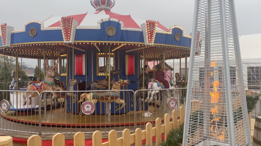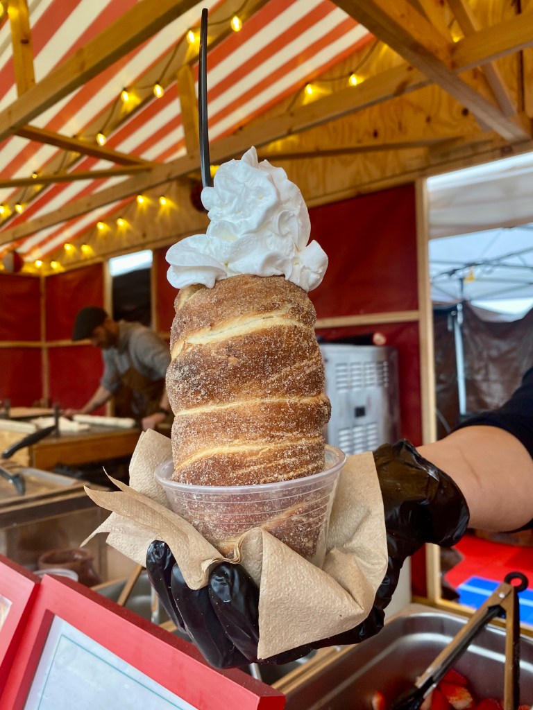 Back to my experience … I sipped on a cup of apple cider as I walked along the festival taking in the sights and sounds while breathing in the intoxicating smells of schnitzels, brats, waffles, pretzels, potato pancakes and chimney cakes. This was my first taste of a chimney cake—a twisted layer of cinnamon pastry filled with strawberries or apples, caramel, and whipped cream. I’ve heard that chimney cakes date back to the 15th century in Europe. If you start feeling a chill, they’ve got you covered … literally. There are cozy fire pits at the entrance, a warming tent, and picnic tables nestled in wooden booths with heaters to keep you toasty.