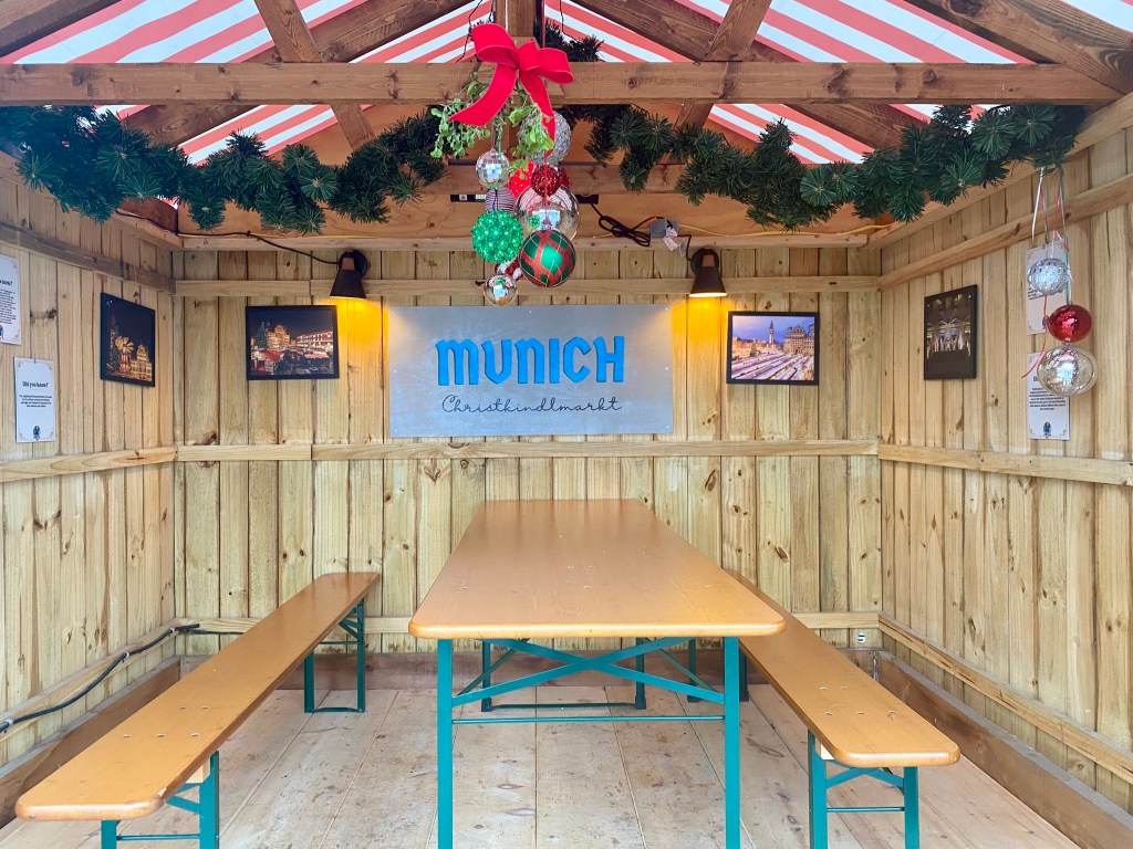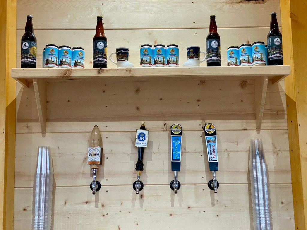 Now, let’s talk about the food. There’s an array of mouthwatering treats waiting to tempt your taste buds. Yummy offerings include savory dishes and European baked goods to satisfy your sweet tooth. You can gulp down German beer including a seasonal blend brewed for the 2023 Christkindlmarkt, or sip on a cup of piping hot apple cider or rich hot chocolate. Personally, I couldn’t resist trying the wheat beer with coriander and orange peel brewed by Goat Island Brewing. Oh, and did I mention how incredibly cool the can design is? I had to take one home as a souvenir. A six pack would make an awesome Christmas gift for any beer lover.